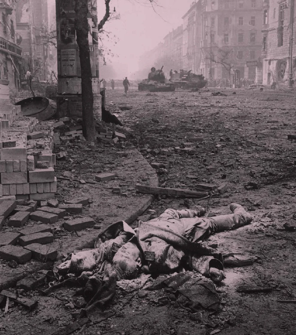 A dead Russian soldier in the streets of Budapest with Russian tanks rolling in the background during the Hungarian Uprising in late October 1956.
