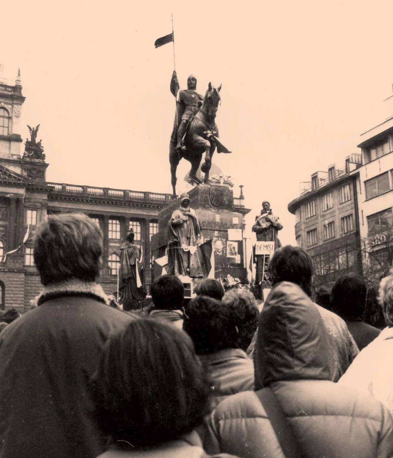 In late November hundreds of thousands of Czechs and Slovaks gather on Wenceslav Square and bring down the Communist government.